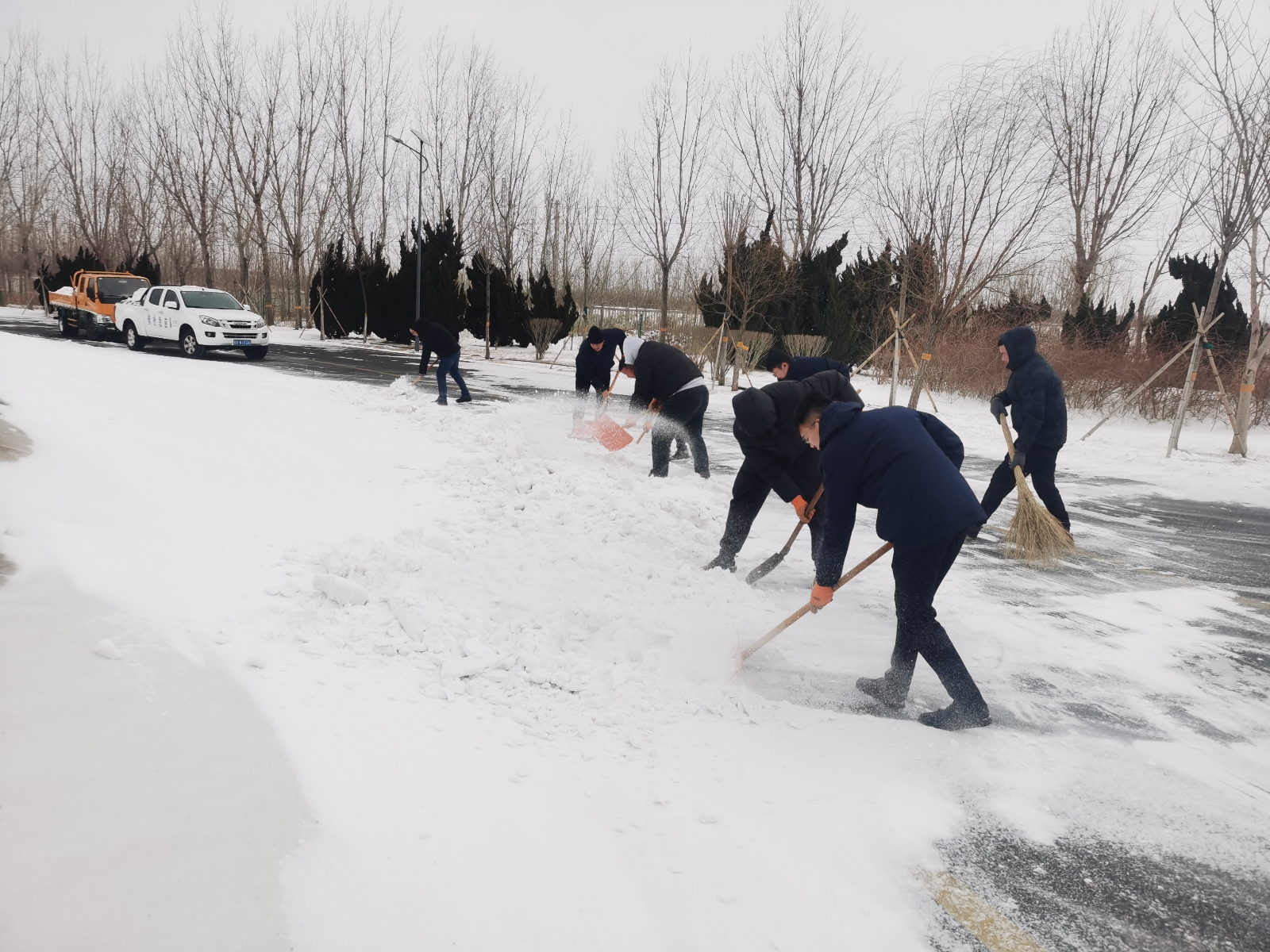 工作人員奮戰(zhàn)在除雪一線,頂風(fēng)冒雪、不懼嚴(yán)寒,手持掃帚、鐵鍬等除雪工具,認(rèn)真細(xì)致地清掃道路積雪,確保出行安全。