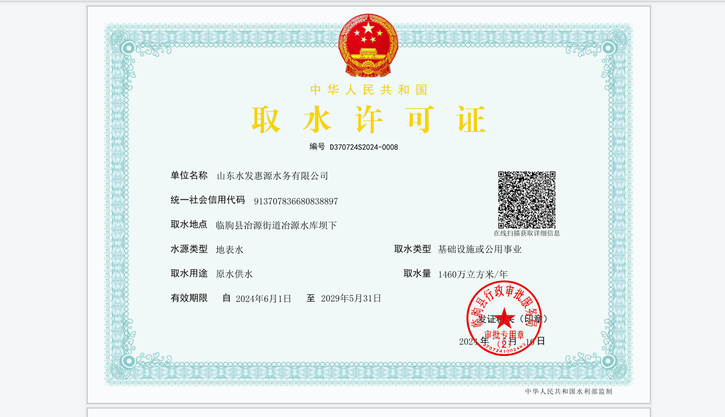 近日,山東水發(fā)惠源水務(wù)有限公司取水許可延續(xù)申請(qǐng)順利通過(guò)臨朐縣行政審批服務(wù)局審批,同意取水許可證自2024年5月31日延續(xù)至2029年5月31日,延續(xù)期五年,取水量1460萬(wàn)立方米/年。